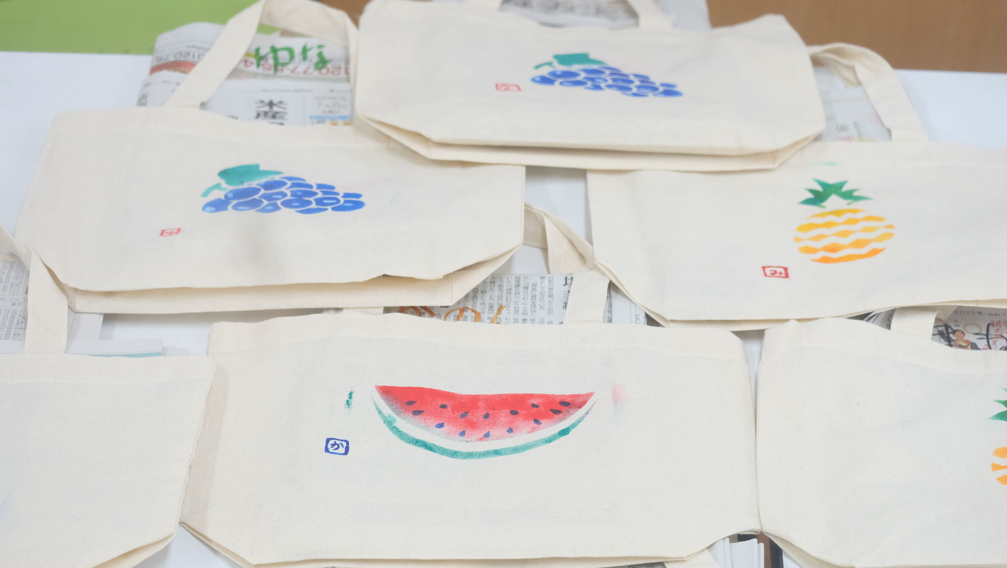 工作2回目は、ステンシルでした。かわいい袋に、スイカ、パイナップル、ブドウの模様を型抜きした画用紙に染料を付けていきます。最後に自分の名前を書いて出来上がりです。